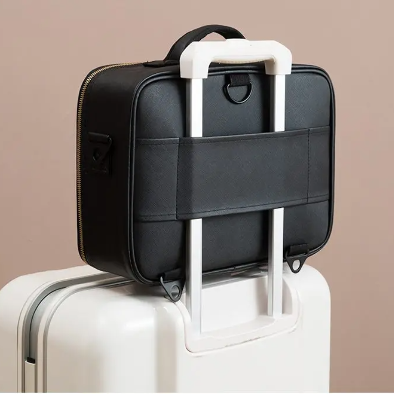 Unsere Kosmetik-Reisetasche bietet dir nicht nur herausragende Organisation und Stil auf Reisen, sondern auch praktischen Komfort. Mit einer speziellen Lasche an der Rückseite kann die Tasche problemlos am Griff deines Koffers befestigt werden. Dies ermöglicht einen mühelosen Transport. Genieße die Freiheit und Bequemlichkeit, deine Schönheitsprodukte sicher und komfortabel zu transportieren.