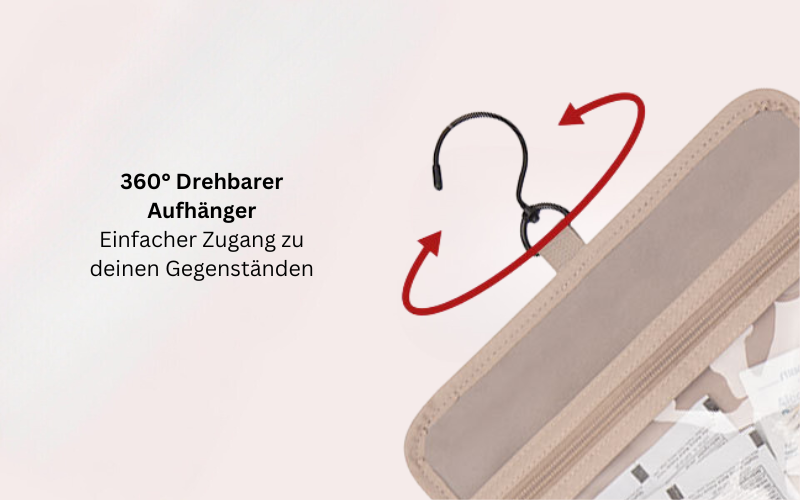 Dank des 360° drehbaren Metallhakens kann die Tasche flexibel an einem Türknauf, einem Kleiderhaken, einem Dusch- oder Handtuchhalter befestigt werden. Dies bietet maximale Flexibilität und Bequemlichkeit bei der Nutzung der Tasche, egal wo du bist.
