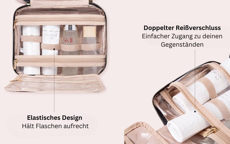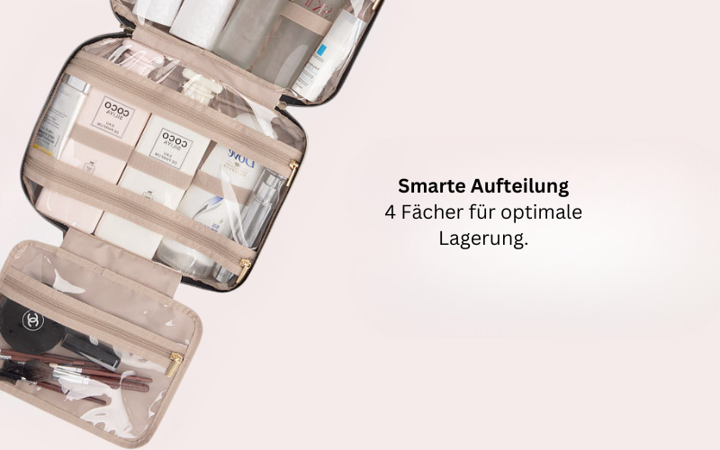 Vier individuelle Fächer ermöglichen eine optimale Organisation deiner Toilettenartikel. Diese durchdachte Aufteilung erfüllt unterschiedlichste Anforderungen und macht die Tasche ideal für die gesamte Familie. Mit dieser praktischen Lösung sind persönliche Pflegeprodukte stets geordnet und griffbereit.